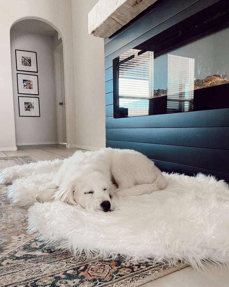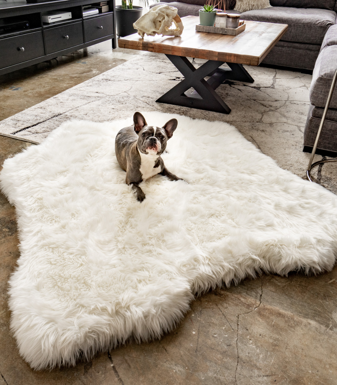 This faux-fur dog bed doubles as a plush cream rug, keeping both your toes and your pup toasty.