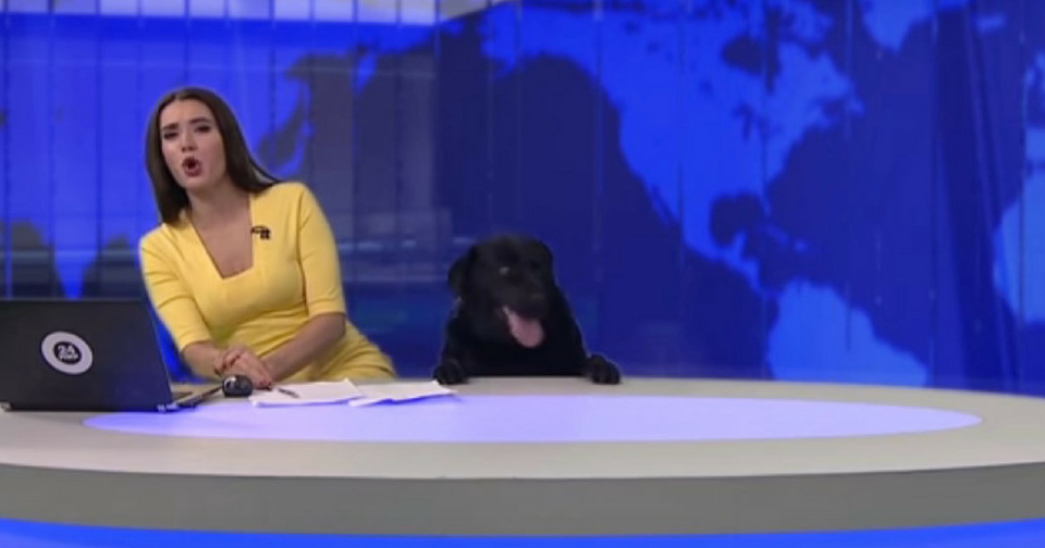 A Russian news live television broadcast was hilariously interrupted by a friendly black dog, who wandered on set quite excitedly. The anchor on Russia's Mir24 TV was in for a surprise when the dog suddenly popped up right next to her startling the anchorwoman, Illona Linarte, who tried to keep her cool, but eventually had to acknowledge the dog in the room.
